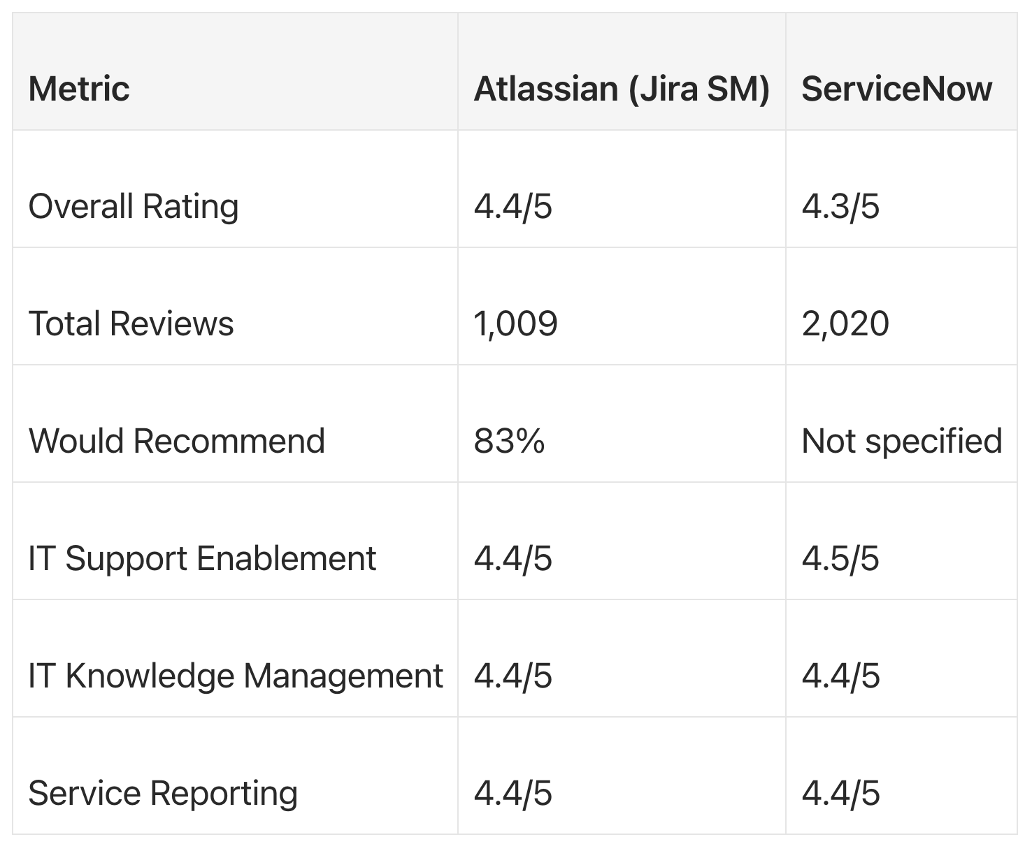 The ratings are remarkably close, with Jira Service Management holding a slight edge in overall satisfaction despite ServiceNow's larger review volume. Both platforms score consistently across capability categories.